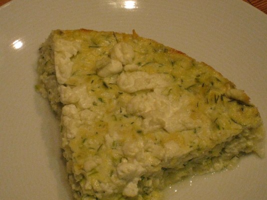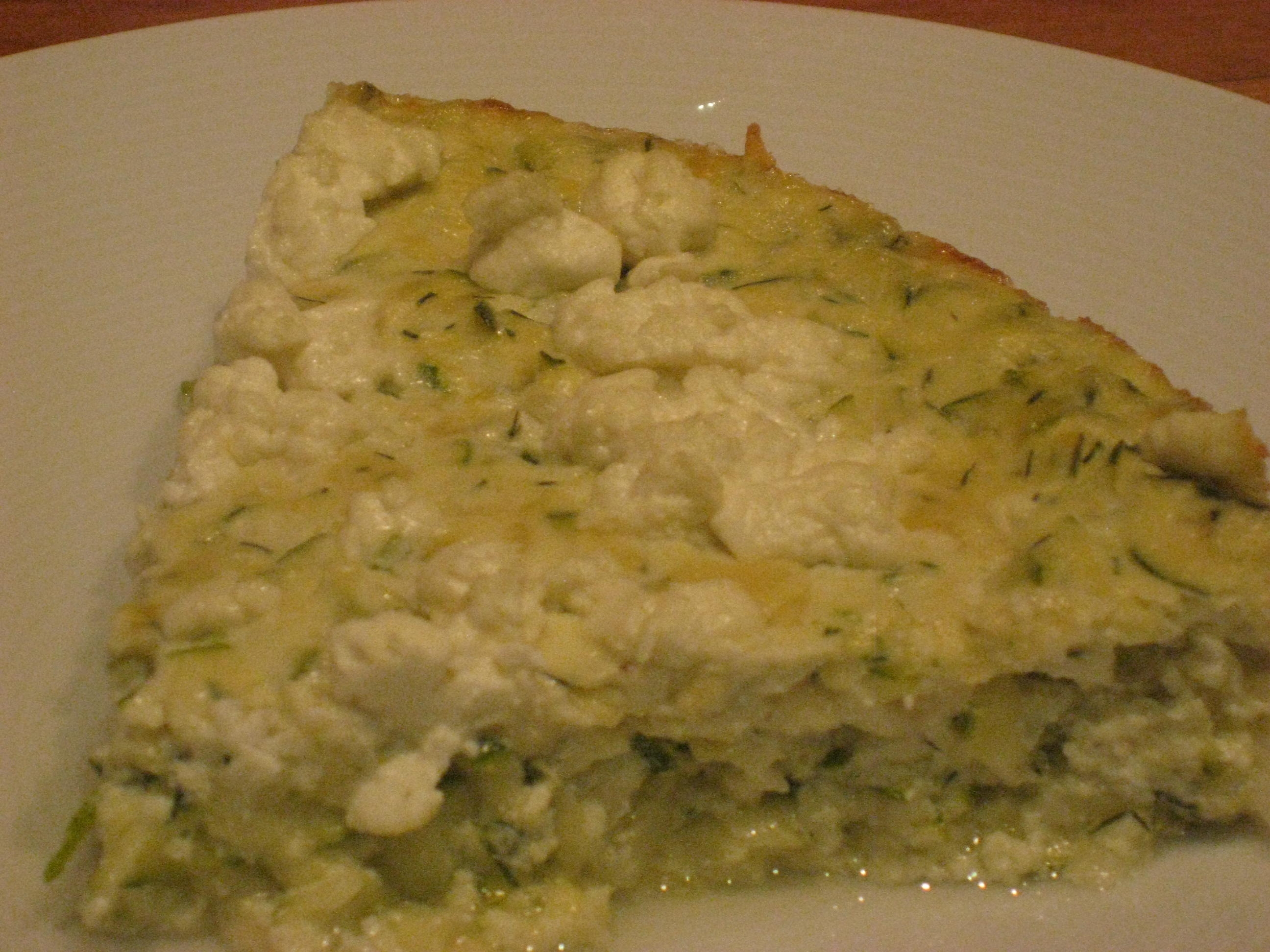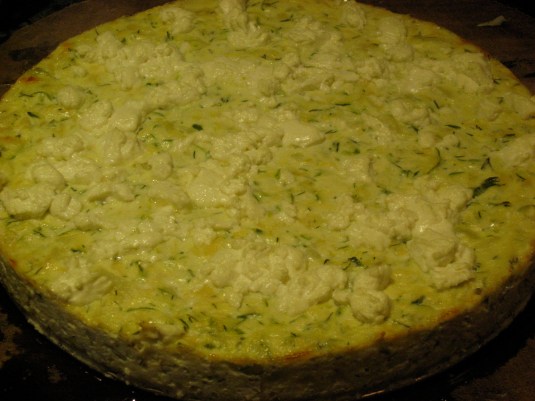 - In the meantime, combine the ricotta cheese, Parmesan cheese, onion, garlic, dill and lemon zest in a medium bowl. Stir in the eggs and continue mixing until well combined. Now stir in the shredded zucchini. Fill the springform pan with the ricotta mixture and place on a baking sheet. Place in the oven and bake for sixty minutes. If there is any moisture left on top of the cake at this point, carefully use a bit of paper towel to dab it off. Now sprinkle with the goat cheese and return to the oven for another 20 -30 minutes or until the goat cheese is melted and the cake barely jiggles in the center (it will set up more as it cools).