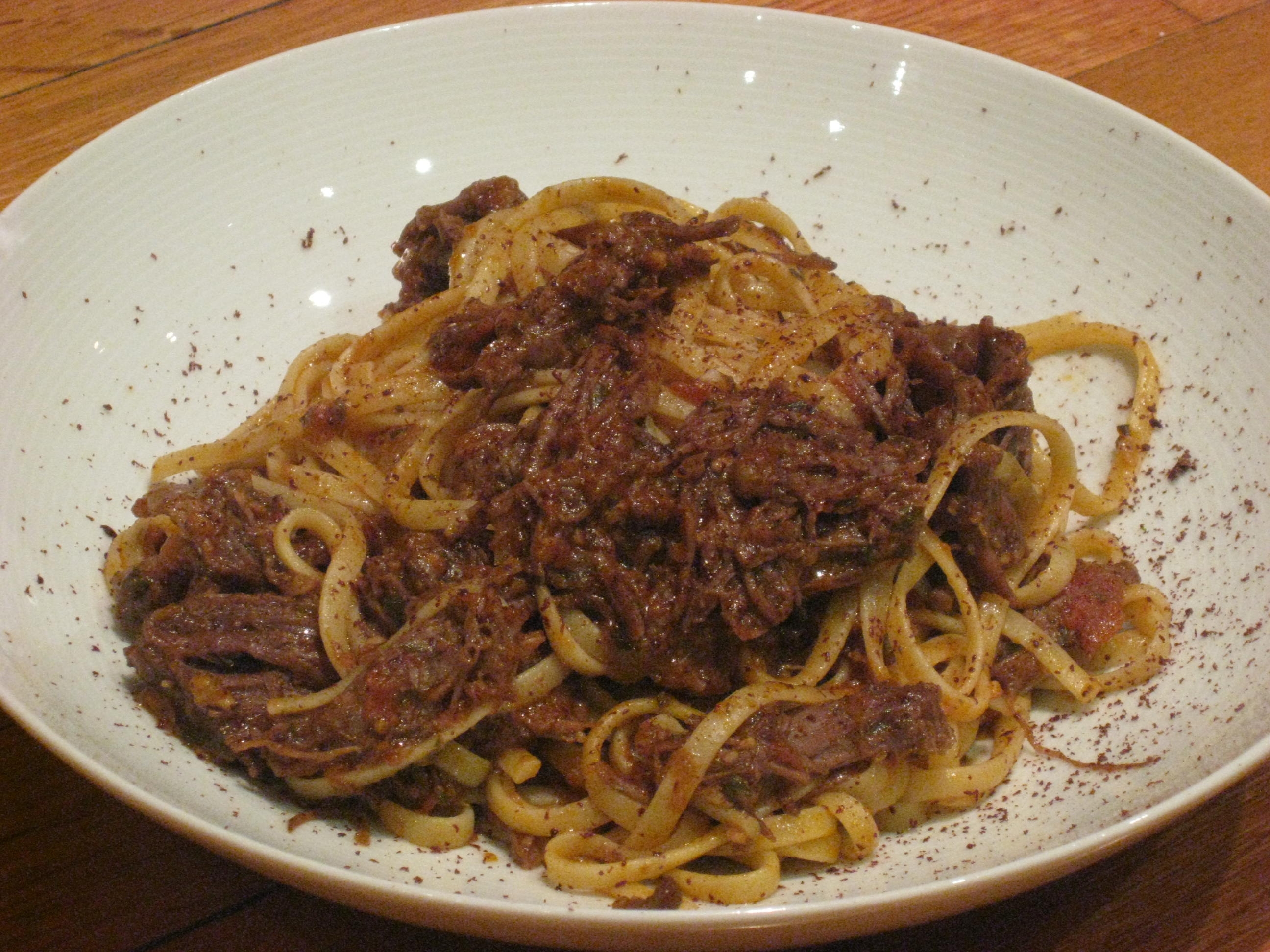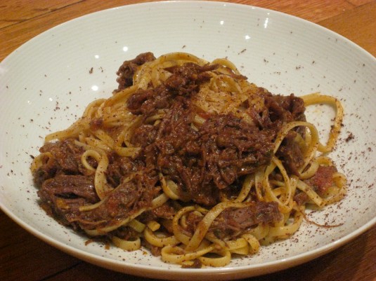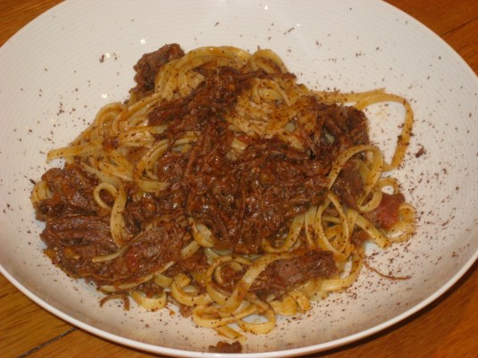 I love making Michael Short Ribs because I know it is one of his favorite things. Rare that I cook red meat at all, but I do this sometimes because I know he likes to eat it every once in a while. He really liked this dish but, as I found out, prefers his meat separate from his pasta. So all the leftovers I packed up were meat only 🙂 He also said that the chocolate didn’t add much, so forget about it if you don’t have that, although it did add a pretty touch to the dish. Overall, he really liked this dish, but I don’t think he has met a short rib he didn’t like.