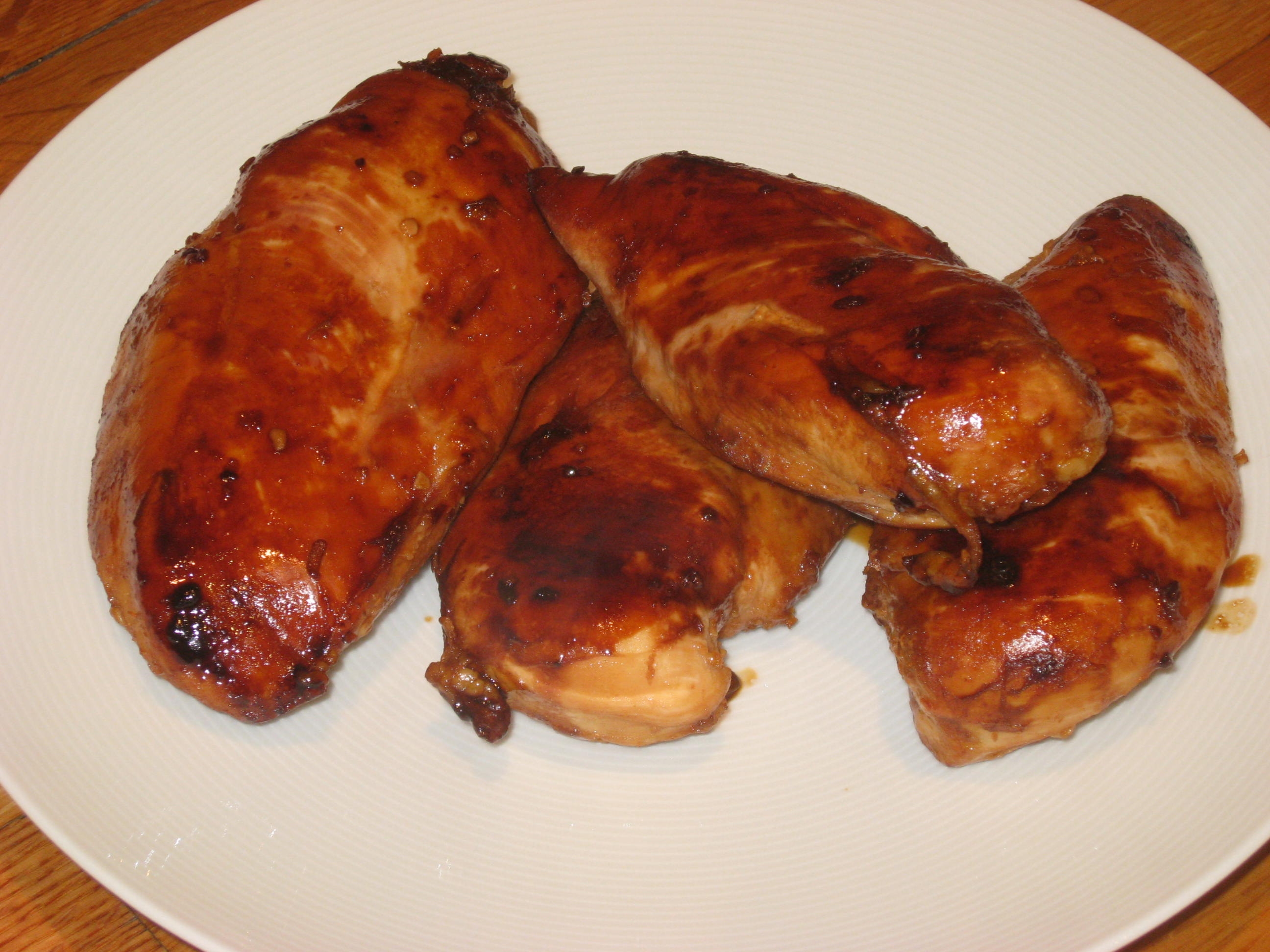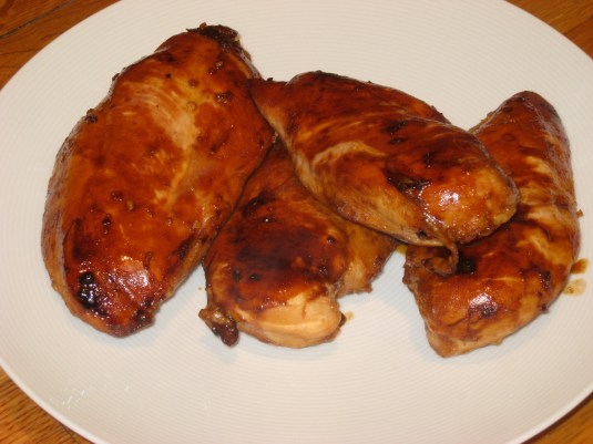 Heat a skillet or grill pan over medium-high heat. Add chicken (reserving marinade) and cook turning once for 15 or so minutes until cooked through. While chicken is cooking reduce marinade in a small pan. During the last 5 minutes of cooking, brush reduced marinade on chicken. Serve and Enjoy!
