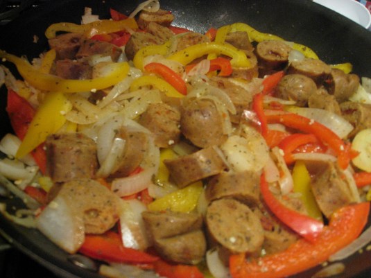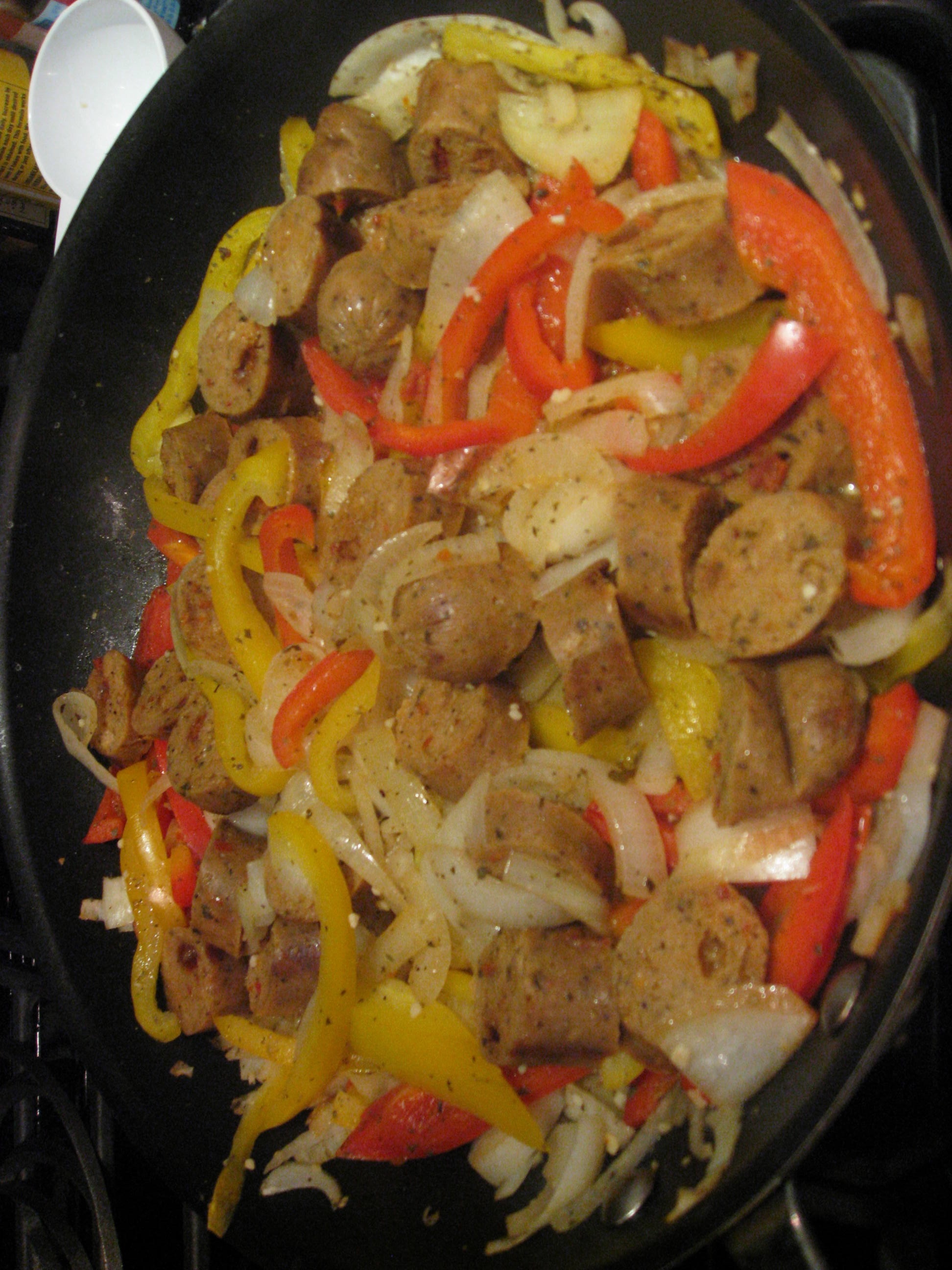 This is a dish my mom always made with meat growing up. I never ate it because I haven’t eaten meat since before I was 7 years old – but I knew how much everyone adored it so I set out to make the vegan version. YUM!!! I love sautéed onions, vegan sausage and peppers, so really I knew I could not go wrong! This is a great dish for vegans and for meat-eaters alike. Field Roast and Tofurkey sausage are so scrumptious that I am sure most people will love them!