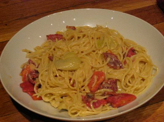 Creamy Pasta with sliced sundried tomatoes, roasted peppers and marinated artichokes