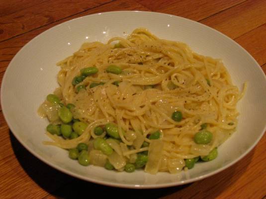 - Add edamame, peas and less than half of sauce and stir until warm and veggies are cooked through
