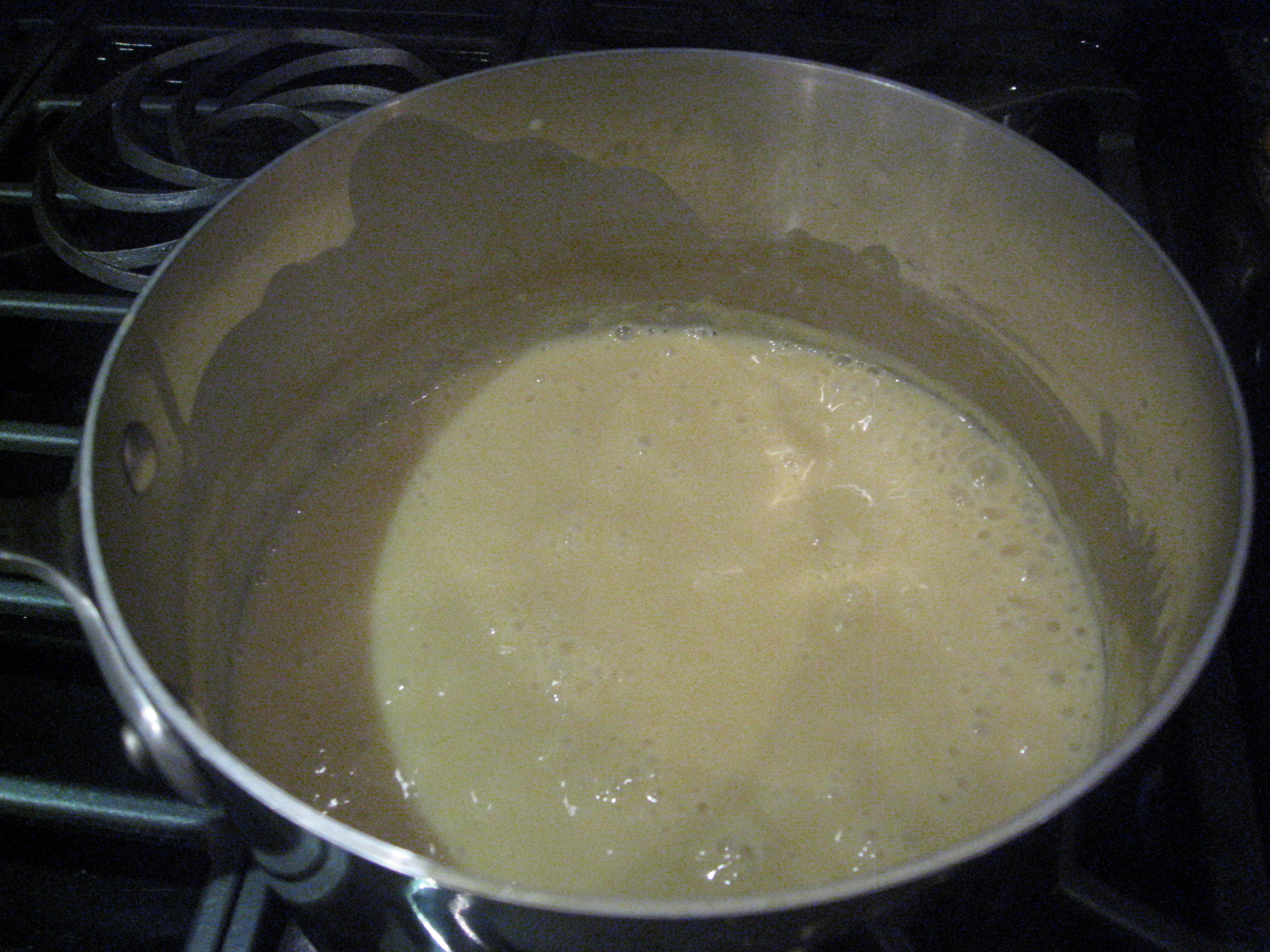 - Stir constantly over high heat until it comes to a boil. Turn down and simmer for a few minutes, until it thickens.
