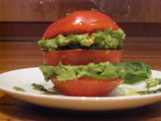 Raw Tomato Napoleon with Basil Cashew Cheeze and Basil Oil