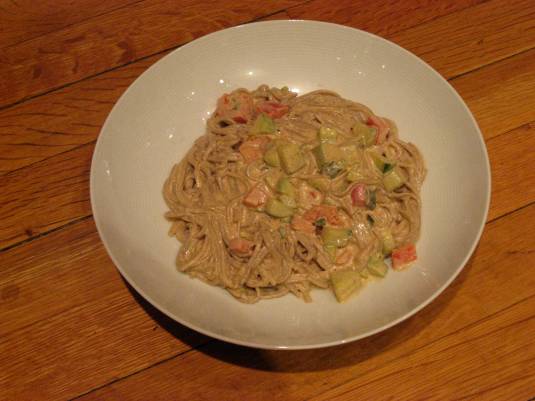 I love pasta, but of course I don’t want to eat plain, white pasta all the time (especially after doing this cleanse). There are fabulous alternatives to traditional pasta – quinoa, rice, buckwheat (soba), etc. Soba is a deeeelish buckwheat noodle that cooks up super fast and tastes great with this sauce. This dish was great for dinner and just as good cold the next day for lunch. YUM!