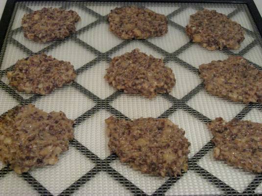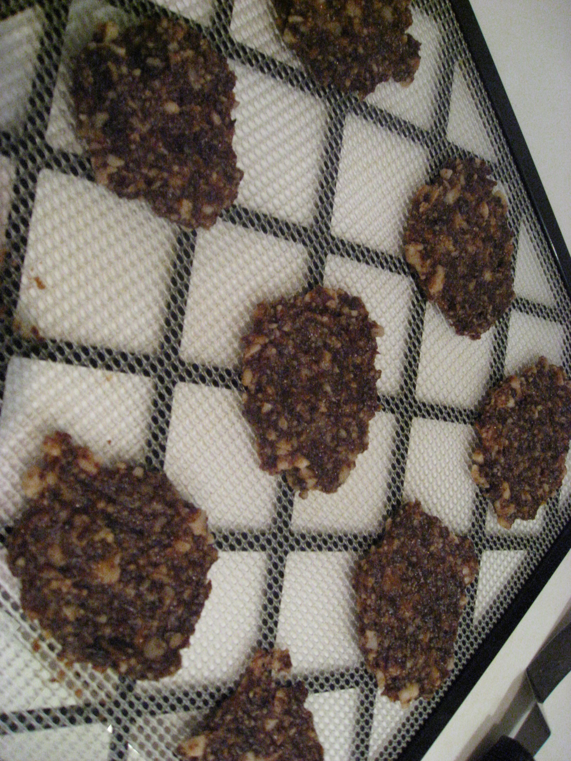 In food processor blend raisins and walnuts until smooth. Add in macadamia nuts and bananas. Spoon into rounds onto the sheet and dehydrate for 8 to 10 hours. Enjoy!!