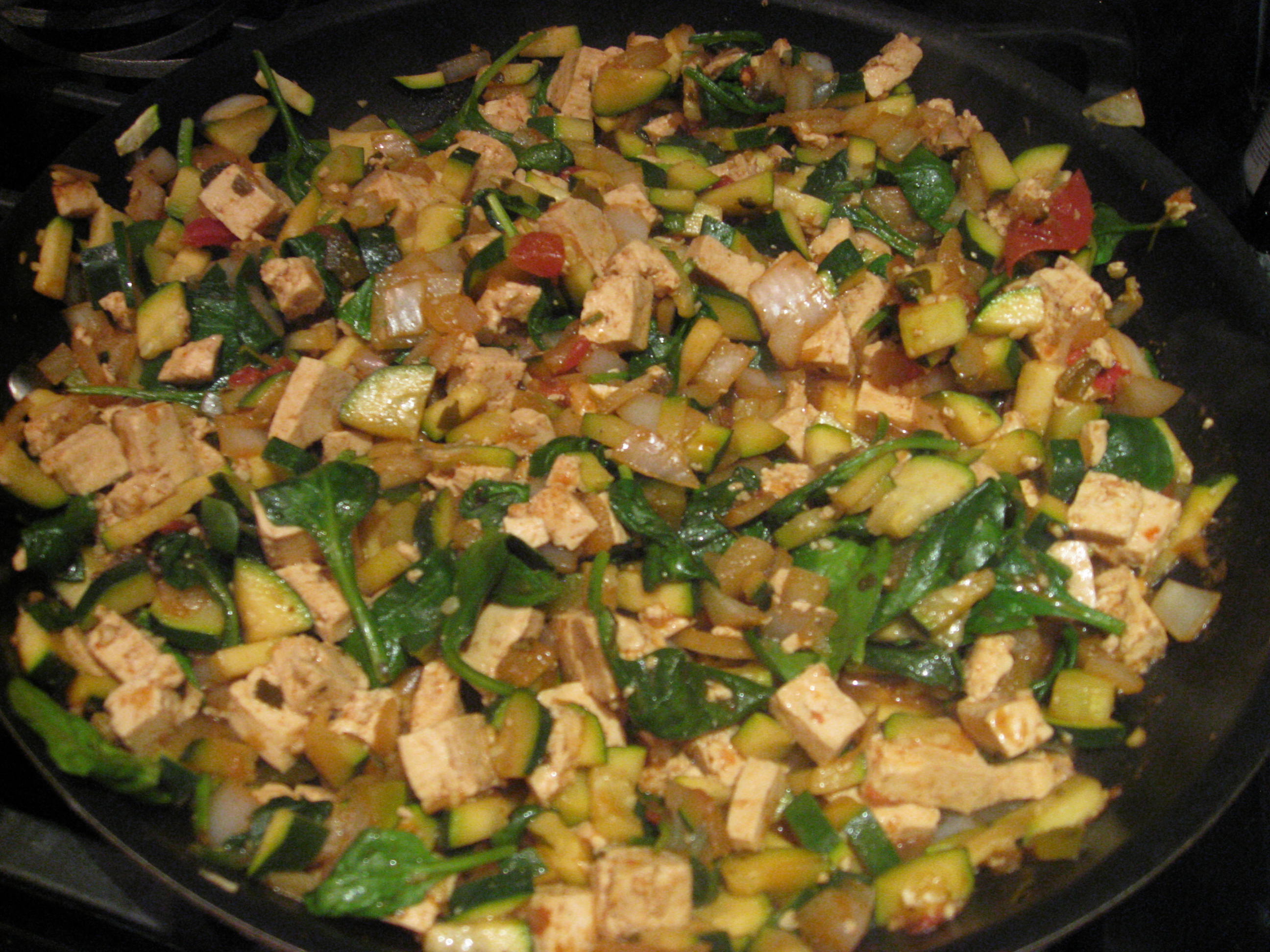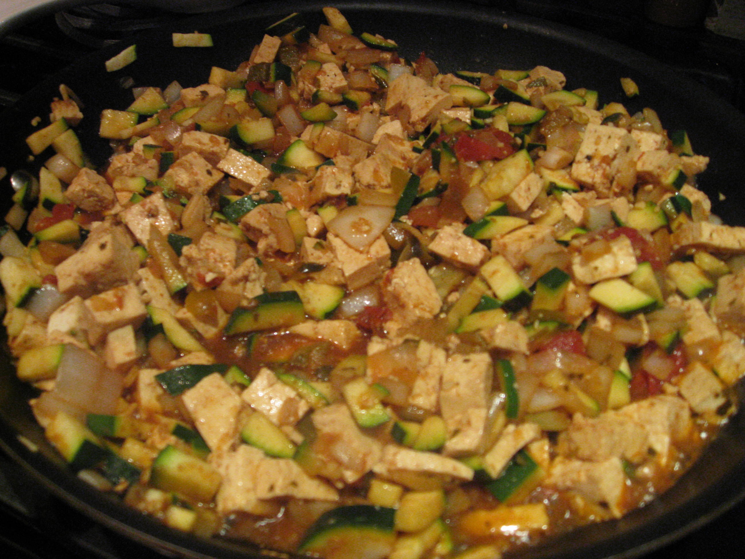 - Add zucchini, tofu, tamari and chili powder. Reduce heat and cook, stirring often, about 5 minutes.
