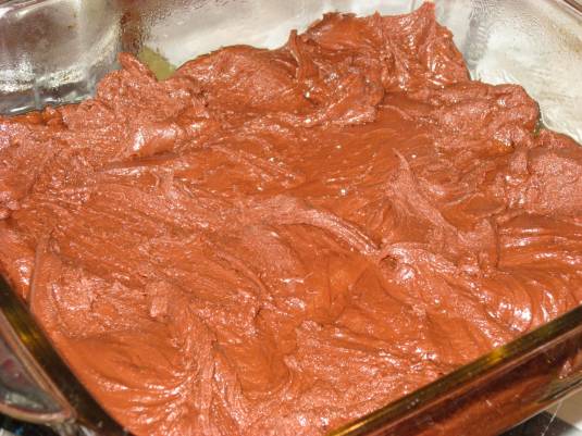 - Mix in the vanilla, and quickly pour everything into your prepared pan, a lightly greased or cooking-sprayed 8×8 pan (or another similar size)
