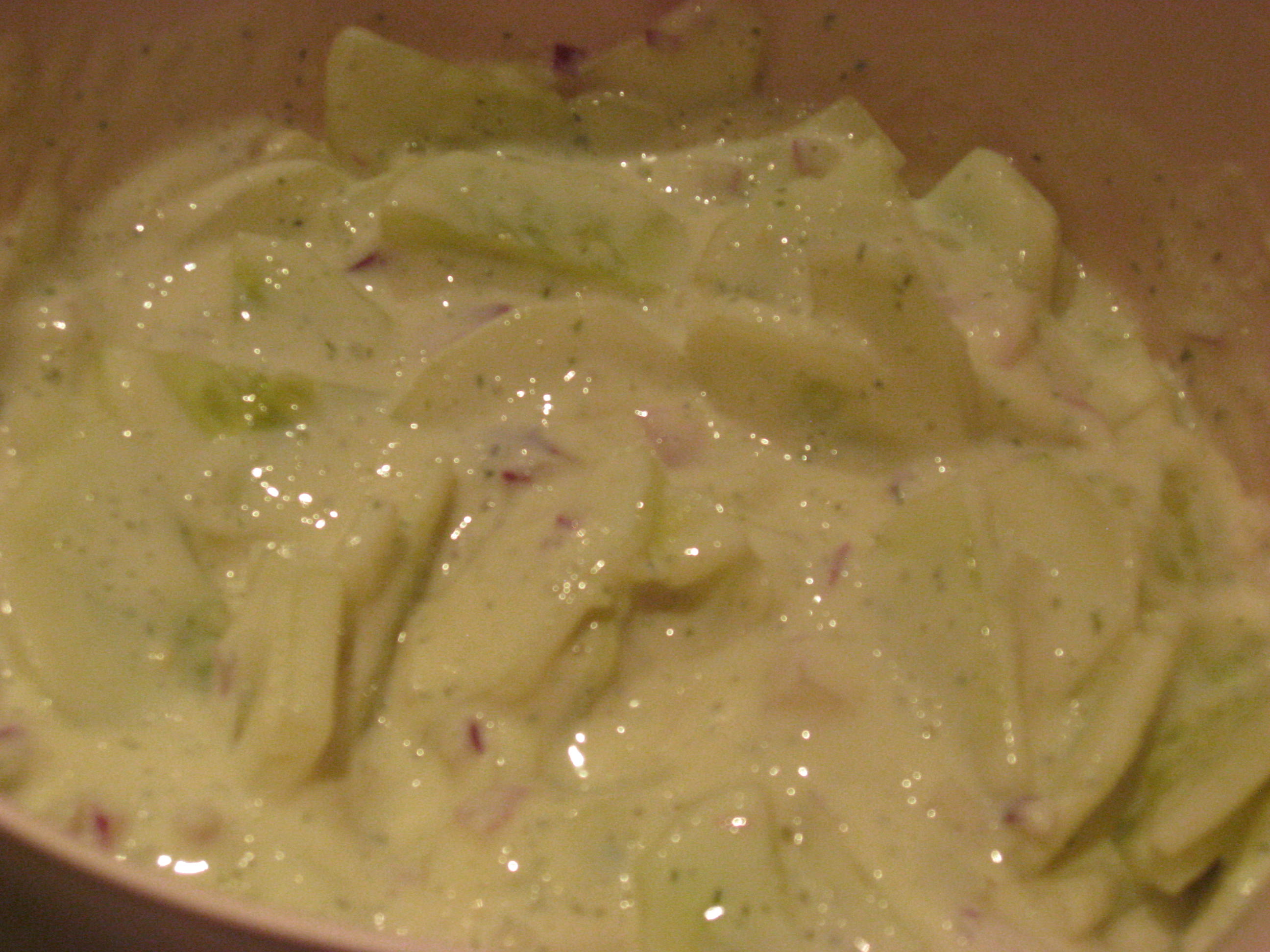 This salad is AMAZING!! Tastes just like the creamy, cucumber salads I had when I was younger. This is so refreshing!! It would taste deelish with anything spicy, immediately cooling you off. Or just eat it on its own, really tasty! This is the most perfect cold salad! Great for a picnic or BBQ 🙂