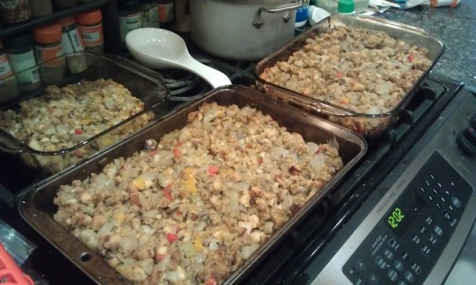 • Basic recipe for 3 boxes or bags of bread stuffing (I used some corn and some multi-grain) (I used about 1.5 cups of margarine & a 32 ounce box of veggie broth. My mom says to use slightly less broth and butter than specified on the package to compensate for liquid in vegetable mixture.)