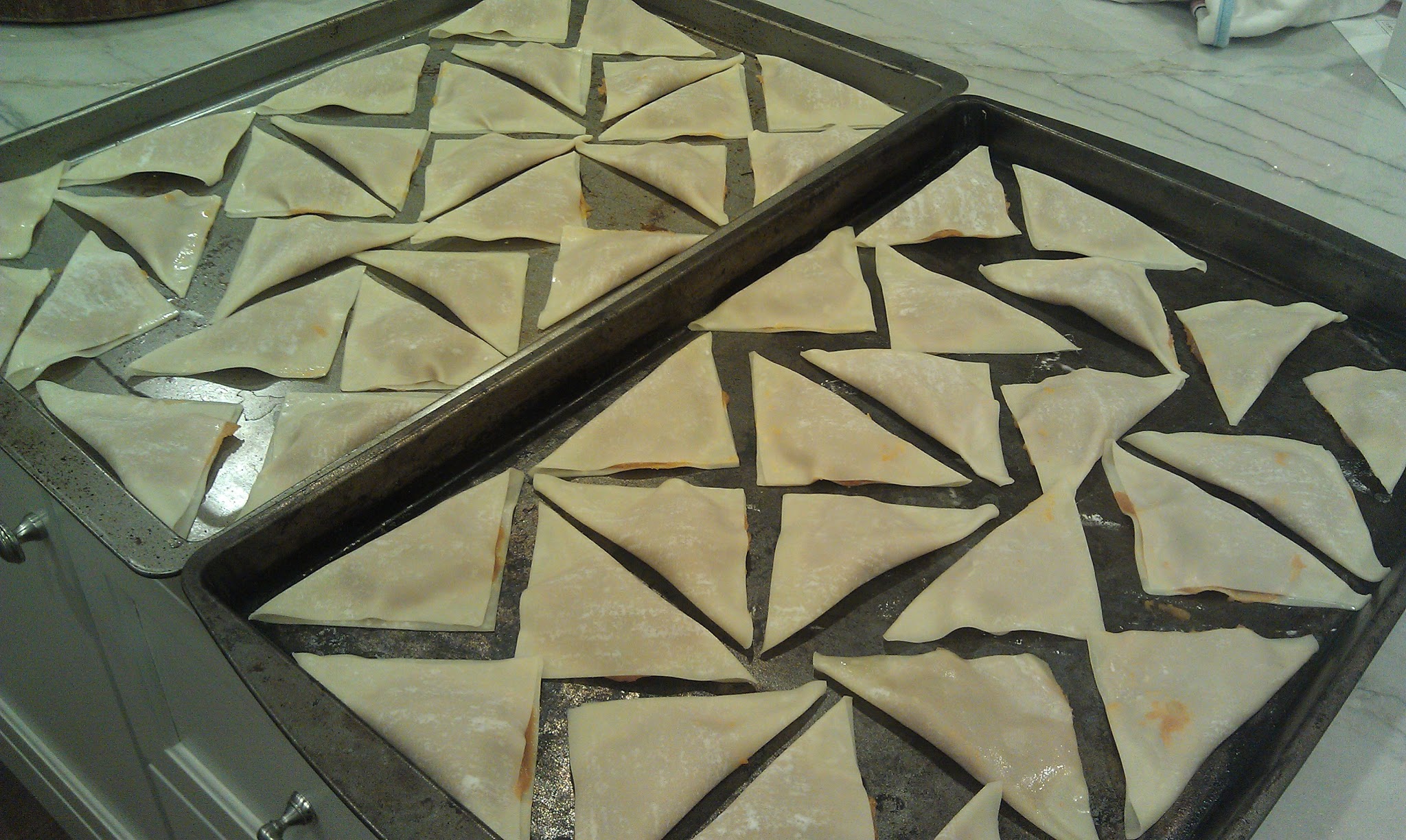 - Place 1 tablespoon filling in the center of each wrapper; brush edges with water. Bring up corners to make a triangle; press to seal. Place on a baking sheet; freeze until firm, 10 to 15 minutes.