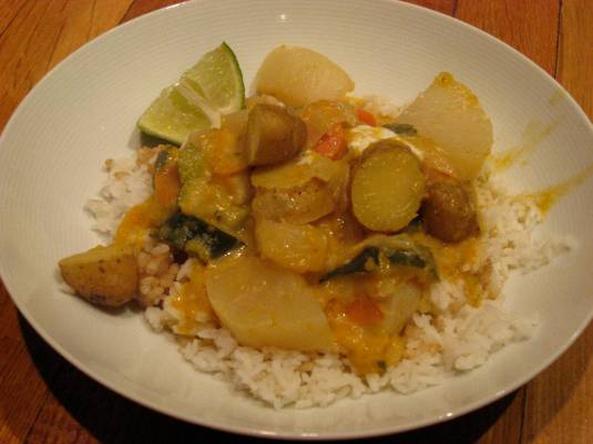Tags: broth, butternut squash, carrot, coconut milk, comfort food, curry, curry paste, ginger, lime, onion, potatoes, quick and easy, rice, thai, tomatoes, turnips, vegan, vegetarian