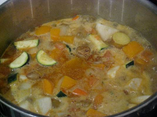 - In the empty broth saucepan boil coconut milk until it reduces in volume by half. The pour over the vegetables and simmer for 5 minutes.