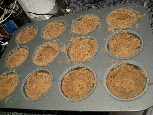 - Mix the crusts – dry ingredients together, then add the wet and stir until well combined. Press about 1/3 cup crust into each cup of a regular muffin pan. With your hands form the cups up the sides and make sure they are pressed well together, without cracks or holes.