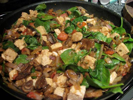 Cook onions and mushrooms for 3 min, add scallions & tomatoes and cook for 2 minutes, add tofu and cook for 10 min, add spinach, yeast, tamari, pepper, hot sauce, crushed red pepper, and curry powder and simmer, stirring gently for 5-10 minutes. Serve and ENJOY 🙂